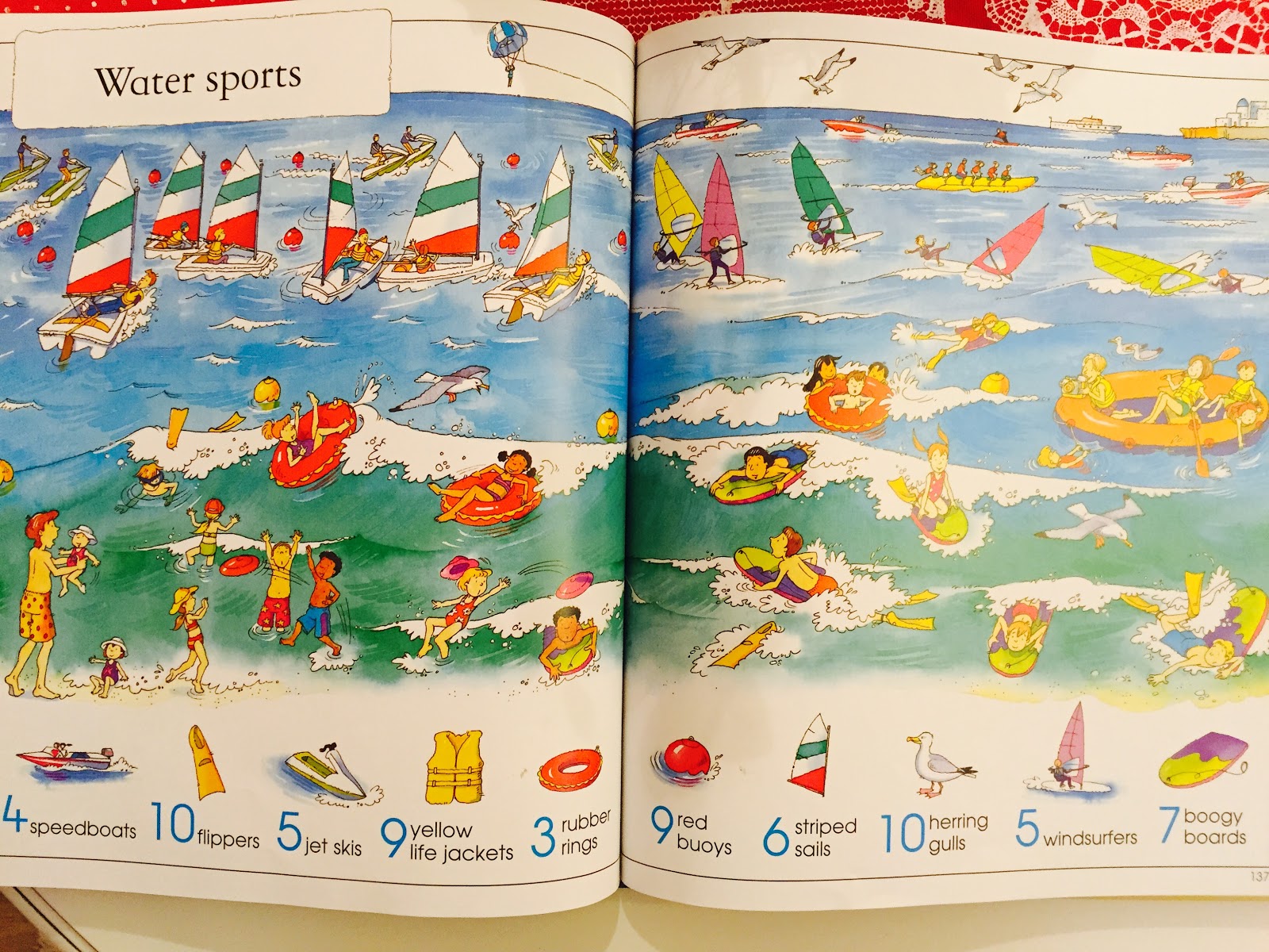 Dacă ați fost fani Hoinari prin anotimpuri și a venit momentul să treceți la nivelul următor, vă fac cea mai bună recomandare: Thousands of Thingsto Spot de la editura Usborne, o carte uriașă de peste 250 pagini, cu o mulțime de activități și elemente de observat. Foile sunt subțiri și lucioase, nu sunt cartonate ca la cărțile cu Hoinari. Pe site-ul Usborne, cartea este recomandată la categoria 5+, dar eu cred ca poate fi introdusă fără probleme de la 3 ani.